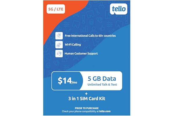 Get 5 GB of data, unlimited minutes and texts for $14/month, on the USA’s largest wireless network.You can bring your own phone or get a Tello phone. Check your phone compatibility on the Tello Mobile website.To bring your phone number to Tello, you need to ensure that, you have purchased, received, and successfully activated your new Tello SIM.Check the coverage map to verify the service in your area. For more details, follow the instructions included in the leaflet.This kit includes a universal simcard (nano-micro-standard size). Before you can start using Tello, you must activate the SIM card on our website.The cellular plan includes free hotspot, there is no contract and absolutely no fees. International Calls to 60+ countries are included in all Tello plans.For Terms and Conditions, check the Tello Mobile website.