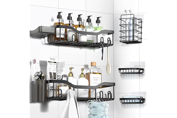 The Veken 6-Pack Adhesive Organizer Set is the perfect way to instantly declutter your bathroom, shower, or kitchen without ever picking up a drill. This comprehensive set provides a mix of high-capacity storage with powerful, reliable adhesive mounting.Exceptional Capacity & Versatility: The set includes a variety of units—typically multiple large caddies/shelves, soap dishes, and a toothbrush holder—offering a complete solution for a family’s worth of products. The different sizes allow for versatile placement not just in the shower, but also in the bathroom or kitchen.Sturdy, Rust-Proof Construction: Crafted from high-quality, waterproof, and rust-resistant materials (often stainless steel with a powder coating), these organizers are built to last in damp environments. They are strong, with the ability to hold a substantial amount of weight—up to 40 lbs in some models—meaning they can easily handle large, heavy shampoo bottles.Damage-Free Installation: Installation is the biggest selling point. The powerful adhesives create a robust, secure bond to smooth surfaces like tile or glass. It’s a true tool-free and drill-free setup, making them ideal for renters or anyone who wants a quick, clean solution.Verdict: For anyone looking for a reliable, high-capacity, and elegant storage upgrade without the hassle of drilling, the Veken 6-Pack is an outstanding value. It seamlessly blends strong performance with a clean, modern aesthetic.