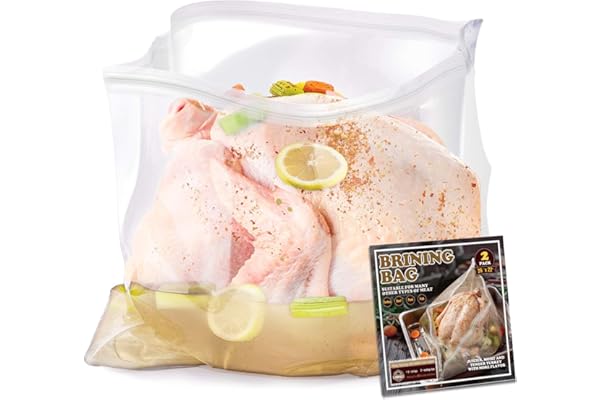 [Great Sealing] Double track zippers turkey brining bags sealed tight without breaking or leaking, and there is no trouble with them opening when you rotated the turkeys in the brine solution every few hours. Come with 2 strings and 2 larger sealing clips, the bags provide you with dual protection, avoiding the bag from expanding outwards and spill through because of the weight of water.[More Durable] Made of heavy duty and BPA-free material, our brining bag is more durable than others. The density of this bag is robust, 125 microns, while other brining bags are only 80 microns. So our bags can securely hold the weight of both the food item and the liquid during the brining process. Moreover, thick seams completely protect against any potential leakage, tears, or rips.[Extra Large Bags] These heavy-duty brining bags can accommodate up to 35 pounds of thanksgiving turkey. There was plenty of space even with the liquid and turkey together. Plus, the bottom of the bag is widened to increase the capacity of the bag. So it is a good choice for you to making thanksgiving, holiday, or dinner party turkey.[Easy to use] Compared with traditional turkey bags, the brining bags is easier to use, avoiding making a mess in kitchen. Just put the turkey in the bag, poured in the brine, squeezed out the air, and sealed it up with the small white clasp. Then tied the bag using strings. Also, you can use the lager clips to prevent the opening from falling part.[Multi-purpose] Built with heavy duty, BPA-free, food-grade standard materials, our turkey brine bags are also ideal for many other types of meats. Great for more than turkey too – use for a marinating bag for shrimp, beef or pork before grilling for a crowd.