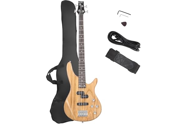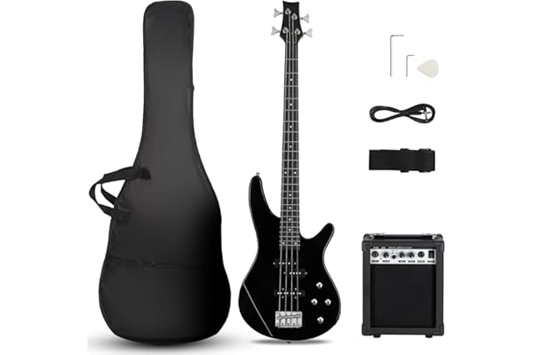 STABLE QUALITY & GREAT FEELING: The body of the electric bass guitar is made of high-quality basswood that features solidity, it also provides the perfect timbre for whatever you play. The ergonomic cut surface and comfortable contour provides a fantastic fret-hand feel when you practice.GREAT TONE FOR ALL STYLE: The material of fretboard is rosewood, which ensure your tone stability and smooth. With 1 split single-coil pickup and 1 single pickup, 2 volume knobs and 2 tone knobs, you can play a variety of music styles from blues to rock in roll.BEST GIFT FOR BEGINNER: The full size bass guitar is a ideal gift for beginners and suits aspiring musicians too. Each 4 strings and string height can be adjusted and you can fine tuning the neck on the top of the fingerboard.EASY TO CARRY BAG: You can either lift or carry the bass, equipped with this portable bass bag. It also offers a protection to you electric bass guitar. Ideal for taking your beloved bass guitar to class, perform, and play music with your band friends.PERFECT ACCESSORIES: Come with 1× Electric Bass Guitar, 1× Portable Guitar Bag, 1× Shoulder Strap, 1× Bass Pick, 1× Amp Cord. You can play our bass immediately after opening a package.