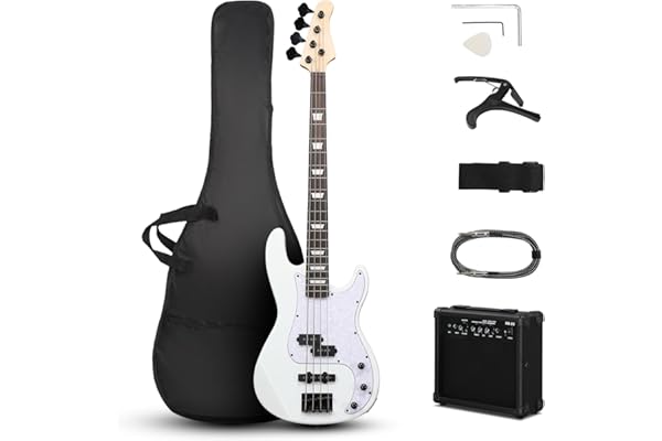 OUTSTANDING SOUND: This electric bass guitar features 1 split single coil pickup and 1 single pickup, combined with 2 volume and 2 tone control knobs to create richer tones. The headstock adopts a dual adjustment lever and a stabilization system, which can better ensure that the intonation and tone are stable at all timesEXQUISITE CRAFTSMANSHIP: The whole body of the electric bass uses the method of three-dimensional cutting to achieve the overall lightweight without affecting the resonance tone. The method of four-bolt fixed connection increases the comfort of high-position playingSUPERIOR MATERIAL: This right hand bass guitar consists of a naturally air-dried fretboard, basswood body and maple neck for better durability and better music performance. Made of nickel-plated carbon steel, our string features thicker strings and larger string tension20-WATT AMPLIFIER: This 20-watt amplifier can produce a more clear sound due to a special mesh design that makes dust difficult to enter the speaker. The amplifier has eight safety corners, which not only be placed more stable but also wear-resistant and non-slipSUITABLE FOR ALL SKILL LEVELS: This 4-string bass guitar is no assembly required and is ready to use right out of the box. It comes with a complete set of accessories for added convenience. This electric bass is a great choice for beginners and experienced musicians of all levels