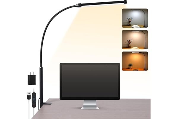 Stepless Dimming Mode: The desk light offers effortless switching of color temperatures (2700K-6500K) and stepless dimming (1% – 100%) to meet your arbitrary color temperature and brightness needs, providing you with a healthy and comfortable office lighting experience. It is perfect for you and your child to read, work, study, unwind, draw, knitting, sew, craftwork, etc360° Adjustable & Long Flexible Gooseneck: The long flexible gooseneck with 360° adjustable, easy adjustment to your preferred position, giving you full control over the direction of light. Our LED table lamp is made of aluminum and ABS material for excellent heat dissipation and a long lifespan of up to 60,000 hours. Additionally, the office lamp includes a built-in wire management feature, allowing you to neatly collect and conceal the wires, ensuring a clean and organized desk setupBig Size & Fit Models: Our table lamp features a 17-inch extra-wide lamp bar that can fully light up your workspace, providing you with enough brightness to complete any task. It is suitable for a maximum work height of about 31 inches, making it compatible with 30-inch monitors (backward compatible with 29-inch, 27-inch, 24-inch, and other monitors). Office desk lamp with easy installation and an adjustable metal clamp design, the sturdy metal clips can support desktops up to 2.36 inches thickEnergy Saving & Eye Care: Our eye care light is composed of 100 high-quality lamp beads, it consumes a remarkable 85% less energy than traditional incandescent lamps. This clip lamp experience uniform brightness, a wide lighting range, and an absence of bothersome strobes, blue light hazards, and glare. Our lamp emits soft, eye-friendly light that safeguards your eyesight and minimizes eye fatigue even during extended periods of use.Reliable USB Adapter & Customer Service: To ensure a seamless experience, office desk lamp come with a complimentary 5V/3A reliable adapter, providing you with everything you need right out of the box. The package includes: 1x Eye-caring Desk Lamp, 1x Metal Clamp, 1x Power Adapter(5V/3A), 1x User Manual. our dedicated customer support team is here to assist you promptly and effectively