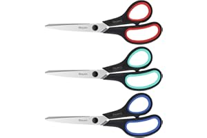 3 Pairs of Quality All Purpose Scissors — 2.5mm Thickness Sharp Blade, comfort-Grip Handle, Heavy Duty Scissors Great for cutting burlap, paper, card stock, cardboard, wrapping paper, light line, fabric, tape, photos, coupons, and opening boxes & packaging. Surprised for sewing, tailoring, quilting, dressmaking, cutting patterns, cutting quilting, Vinyl, Leather, and making face masks.2.5MM Thickness Precise Smooth Cutting Heavy Duty Scissors — They strongly allow you to make precise cuts with great control as the blade has the perfect amount of friction, which is very comfortable to use. 3 pairs of straight handled scissors for smooth, efficient cutting scissors for general use. Suitable for teachers’ middle/high school classroom supplies.Sharp Office Scissors — Stainless steel blades enable high-density steel that makes it 3 times harder than normal stainless steel and is smoother cutting. 6 X longer lasting than the previous formula and remain sharp for 100,000 + cuts. Blades stay sharper longer; We chose bright colors, Black Green/Black Red/Black Blue. Different color rubber handles are used in different places, comfort-Grip holes let you maintain a comfortable, can be used left- or right-handed.iBayam 8-Inch comfort-Grip Scissors for Left and Right Hand — 3 Special scissors are suitable for most items that need to be cut. It can also be used as a household scissors for cutting open frozen food bags ready for cooking. Convenient, sturdy, especially sharp scissors.Exclusive Scissors for Multiple Uses in Various Rooms– in the Handcraft Workshop, bathroom, sewing room, laundry room, craft room, at the office, great for most regular household tasks.