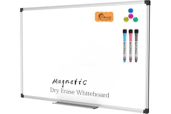 【Premium Magnetic White Board】Overall Size (frame included): 35.6″ x 23.8″, Writing Surface Size: 34.5″ x 22.6″; Comes with 1 dry eraser, 3 dry erase markers, 4 magnets, 1 pen holder and fixing kits. Great help for business professional, project manager, clerk, teacher, student and parent etc.【Smooth Writing & Easy to Wipe】Specially scratch-resistant surface lets all dry erase markers write smoothly and wipe clean easily, without ghosting or staining. XBoard has always been committed to providing you with an excellent writing experience!【Using High Quality Raw Materials】Sturdy thickened aluminium frame, detachable and movable marker tray, smooth high-grade nylon plastic corners, no sharp or pointed edges, all of these ensure that the safety for you to use.【Multiple Uses & Installation Ways】Flexible installation with fixing kits, either horizontally or vertically. Perfect for office meetings, school teaching and home presentations, dual as a bulletin board by using magnets to pin notes, messages, pictures, calendars and more.【Credible Packaging & After-Sales】You can rest assured that XBoard dry erase boards are shipped in reinforced packaging to prevent damage and warping. Contact us for a free replacement if you have any issues with new arrivals!