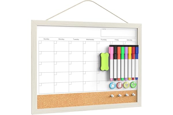 2-in-1 WHITEBOARD CALENDAR & CORKBOARD – This wall dry erase calendar can be used as a monthly and weekly planner board, memo board, bulletin board or presentation board. The bottom cork board is perfect for pinning notes, pictures, to-do lists and class schedules.2 MOUNTING OPTIONS – You can hang the dry erase board calendar on the wall or mount it to the wall with the included screws.QUALITY CALENDAR WHITEBOARD – This dry erase board is made of high quality materials, the wooden frame is sturdy, easy to write and erase, the lines won’t fade, and is designed for long-term use.WIDE RANGE OF APPLICATIONS – Our wall whiteboard calendars with elegant and vintage wood frames are perfect for kitchens, cubicles, offices, dorm rooms, cafes, dining rooms, living rooms and more.CONTAINS EVERYTHING YOU NEED TO GET STARTED – This white board calendar dry erase set includes a 17×13 inch presentation board, 8 markers, 4 push pins, 4 magnets and 1 eraser. Enjoy the dry erase calendar and cork board combo as soon as you receive it!