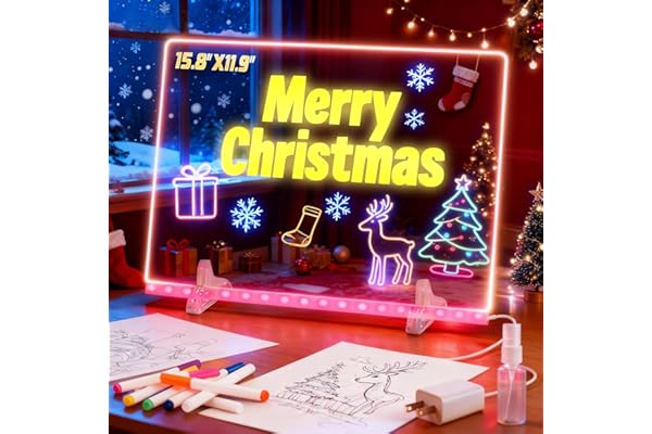 This product is enjoyable and highly versatile, making it useful for people of all ages. It’s perfect for holidays—sharing announcements, creating menus, organizing schedules, managing grocery lists, or leaving messages. Its vibrant colors are appealing without being overwhelming, so you can leave it on all day. You can display it in windows to greet guests or communicate with trick-or-treaters, holiday visitors, or anyone.Cleaning the screen is simple with a cloth, though it’s wise to keep some quality glass cleaner nearby and wear gloves when writing to avoid smudges, which can be tough to remove otherwise. Ideal for entertaining both kids and adults, as it offers countless possibilities and justifies its cost by being usable year-round.Featuring a vibrant 7-color LED display with four dynamic modes, this LED drawing board brings any space to life. Choose from static or jumping effects across seven dazzling colors and adjust the brightness for comfortable viewing in any setting.With a large 15.8″ x 11.9″ acrylic surface—bigger than most drawing pads—you’ll have plenty of room for your ideas. The kit comes ready to use and includes 7 colorful dry-erase markers, 2 soft cleaning cloths, 1 hanging chain, 1 cleaning spray bottle, 1 pair soft white gloves that are one size fits all, and 2 table stands making it perfect as a magic board for kids ages 8-12.No need to worry about batteries since the Lumi board plugs directly into any wall outlet with the included US adapter, offering an energy-efficient and reliable alternative to rechargeable boards for daily drawing, planning, and creative play.rMore than just a toy, this LED drawing board is a valuable developmental tool. It helps students organize tasks and schedules while encouraging hands-on skills in younger children. As a gift, it’s ideal for sparking creativity, promoting screen-free play, and giving parents some well-deserved peace. This LED drawing board is highly recommended.