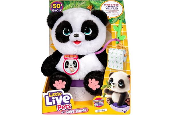 Adorable Interactive Panda: Meet ChuChu, your plush panda baby toy that acts like a real pet! With 50+ realistic sounds and reactions, ChuChu giggles, babbles, and responds to care, becoming your child’s favorite interactive bear companionSoft, Cuddly and Lifelike: Designed with extra-soft materials, this panda stuffed animal is perfect for hugs and pretend play; he kicks his feet, reacts to touch, and loves to be rocked to sleep; an interactive animal toy for kids ages 4 and upFun Feeding Play: This electronic pet includes a bamboo accessory that can be used to feed ChuChu! He makes cute chewing sounds when he’s full, helping kids enjoy nurturing play as they bond with adorable panda toys for boys and girlsMagic Potty Surprise: When your interactive stuffed animal kicks, place him on the potty and watch him do his potty dance; lift the talking bear toy off to reveal a magic poop surprise then flush it away and enjoy repeat potty play again and again!Kids Plush Gift Set: Little Live Pets panda plush gift includes a potty, bamboo accessory, adoption certificate, and batteries. At 30cm tall, ChuChu makes cute panda toys for girls and boys for birthdays, holidays, or any fun occasion kids will love!